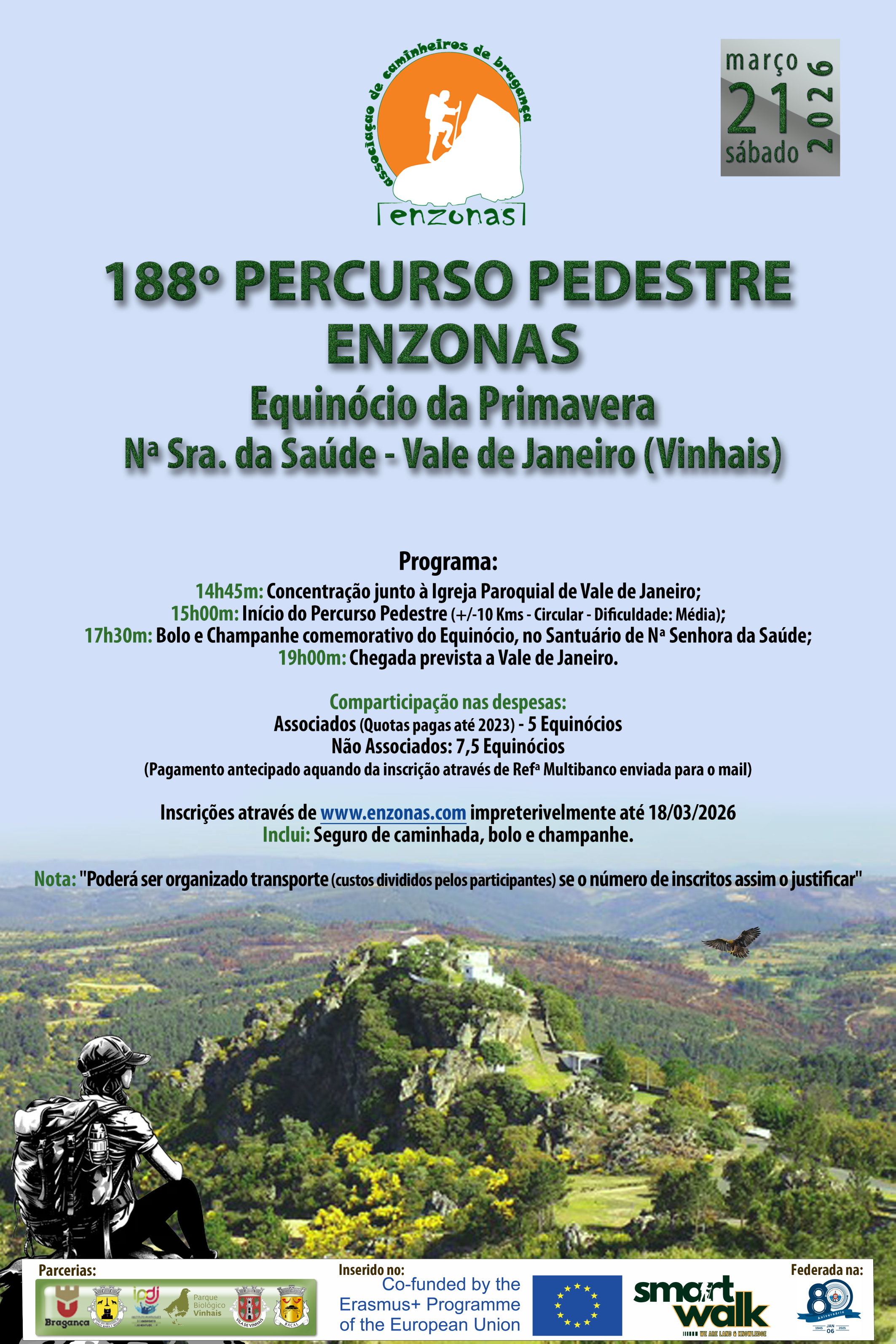 A Associação Caminheiros de Bragança - Enzonas, em colaboração com o Serviço Desconcentrado de Bragança do Instituto Português do Desporto e da Juventude, entre outras entidades, promove no dia 21 de março de 2026, pelas 15h00, um Percurso Pedestre.