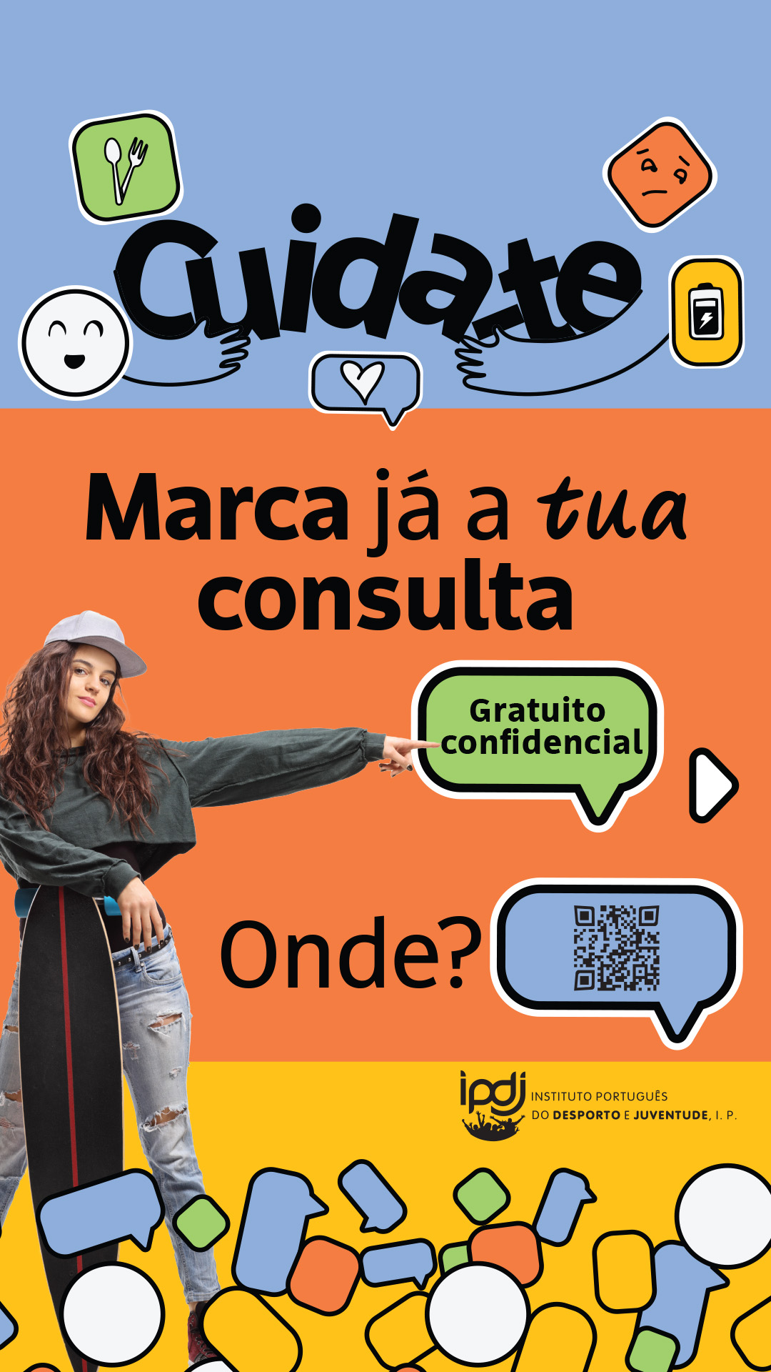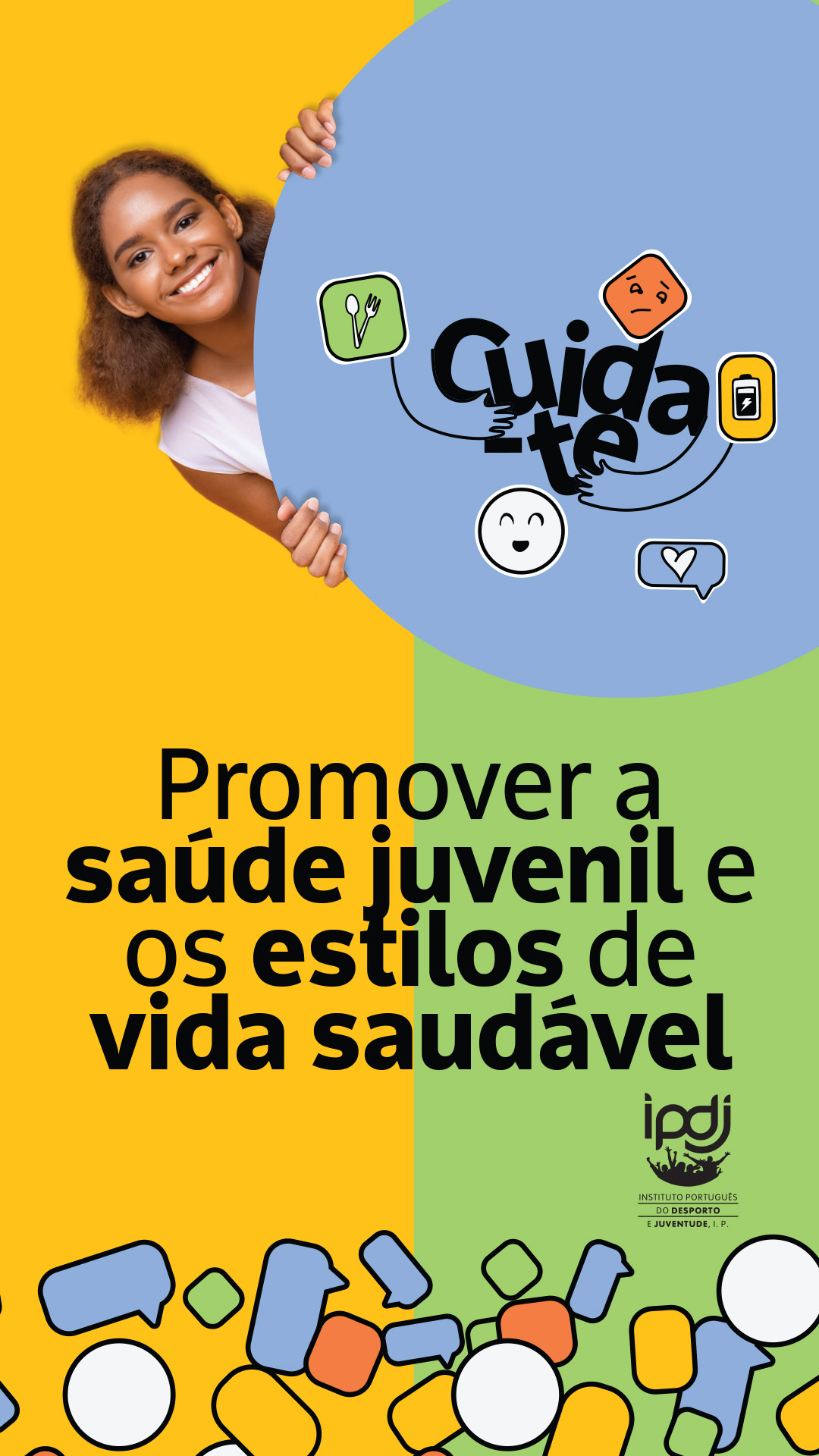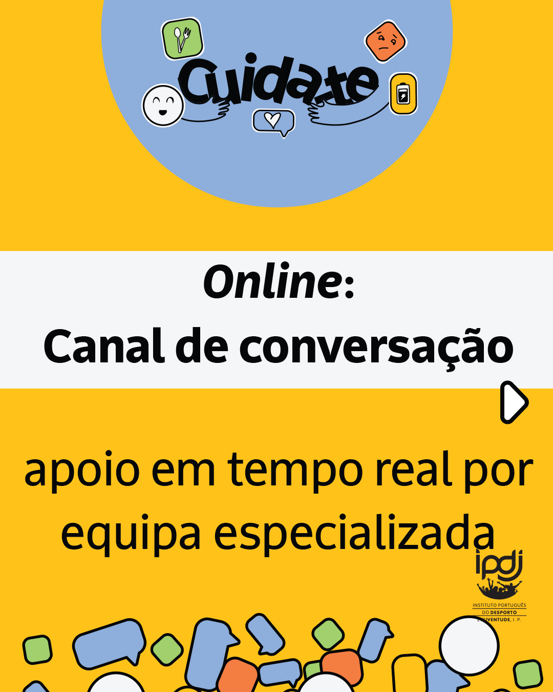 - Canal de Conversação | Ferramenta de comunicação, assegurada por profissionais de saúde, que informam e aconselham personalizadamente pessoas jovens, em tempo real ou com latência diminuta, a partir de informação fidedigna, baseada na evidência, nas áreas de intervenção do Programa. Disponível em "Coloca aqui as tuas dúvidas";