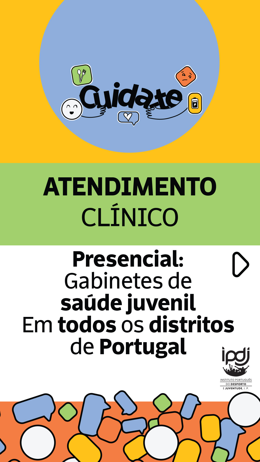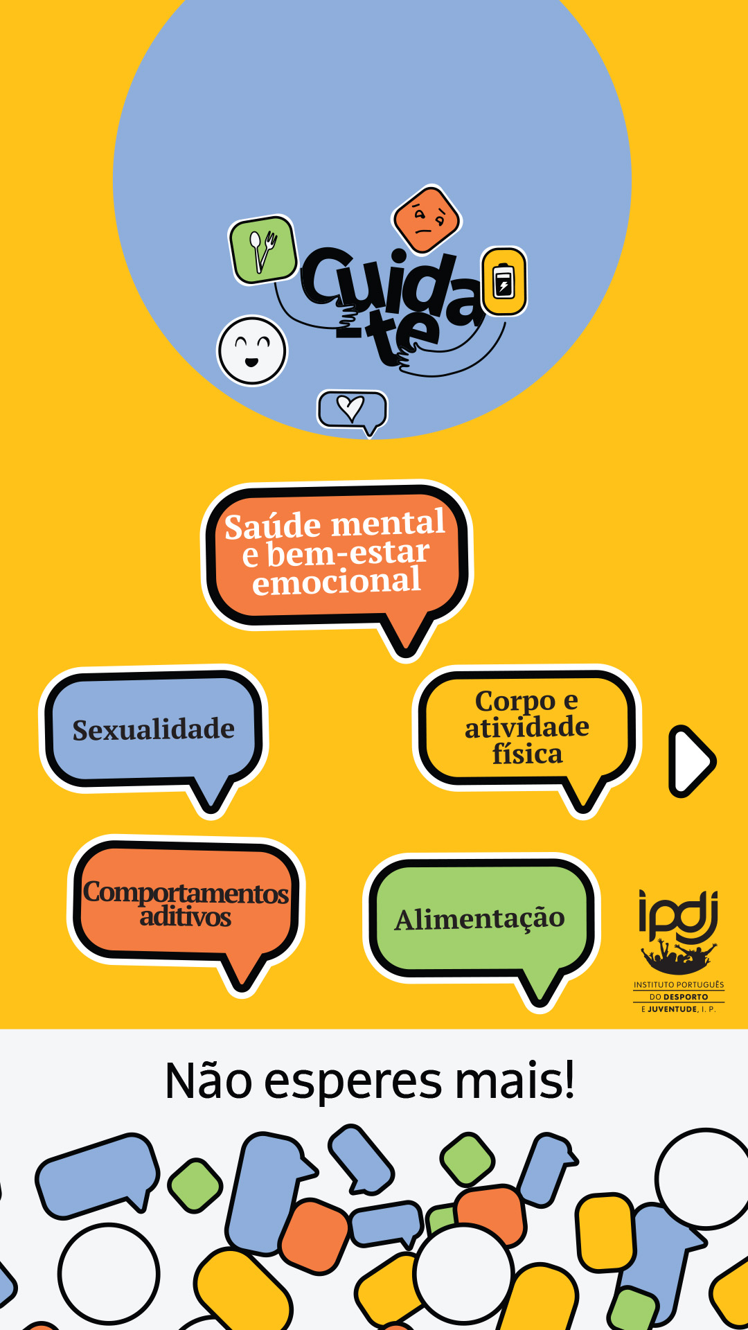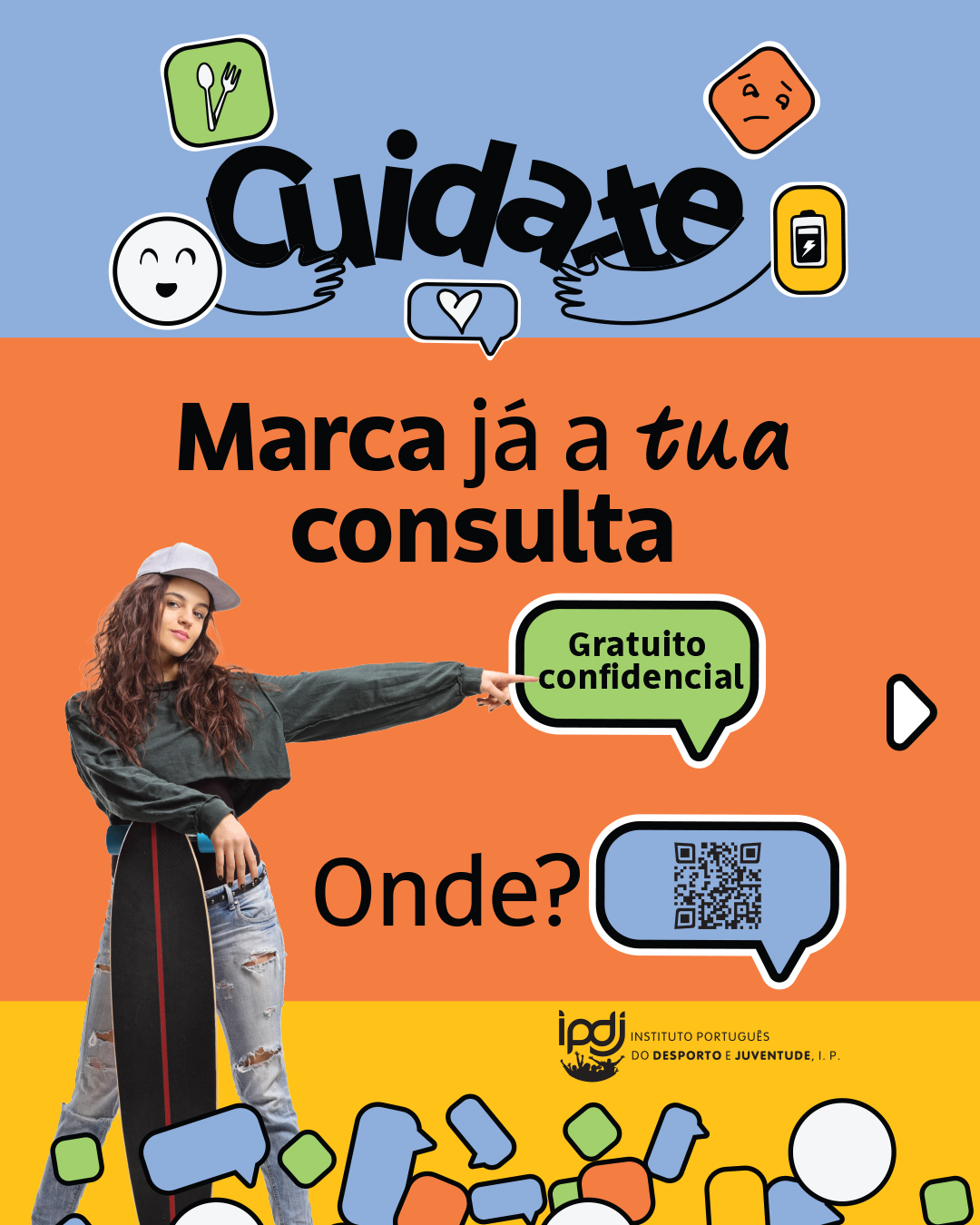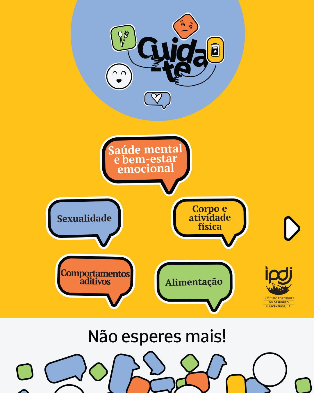 - Canal de Conversação | Ferramenta de comunicação, assegurada por profissionais de saúde, que informam e aconselham personalizadamente pessoas jovens, em tempo real ou com latência diminuta, a partir de informação fidedigna, baseada na evidência, nas áreas de intervenção do Programa. Disponível em "Coloca aqui as tuas dúvidas";