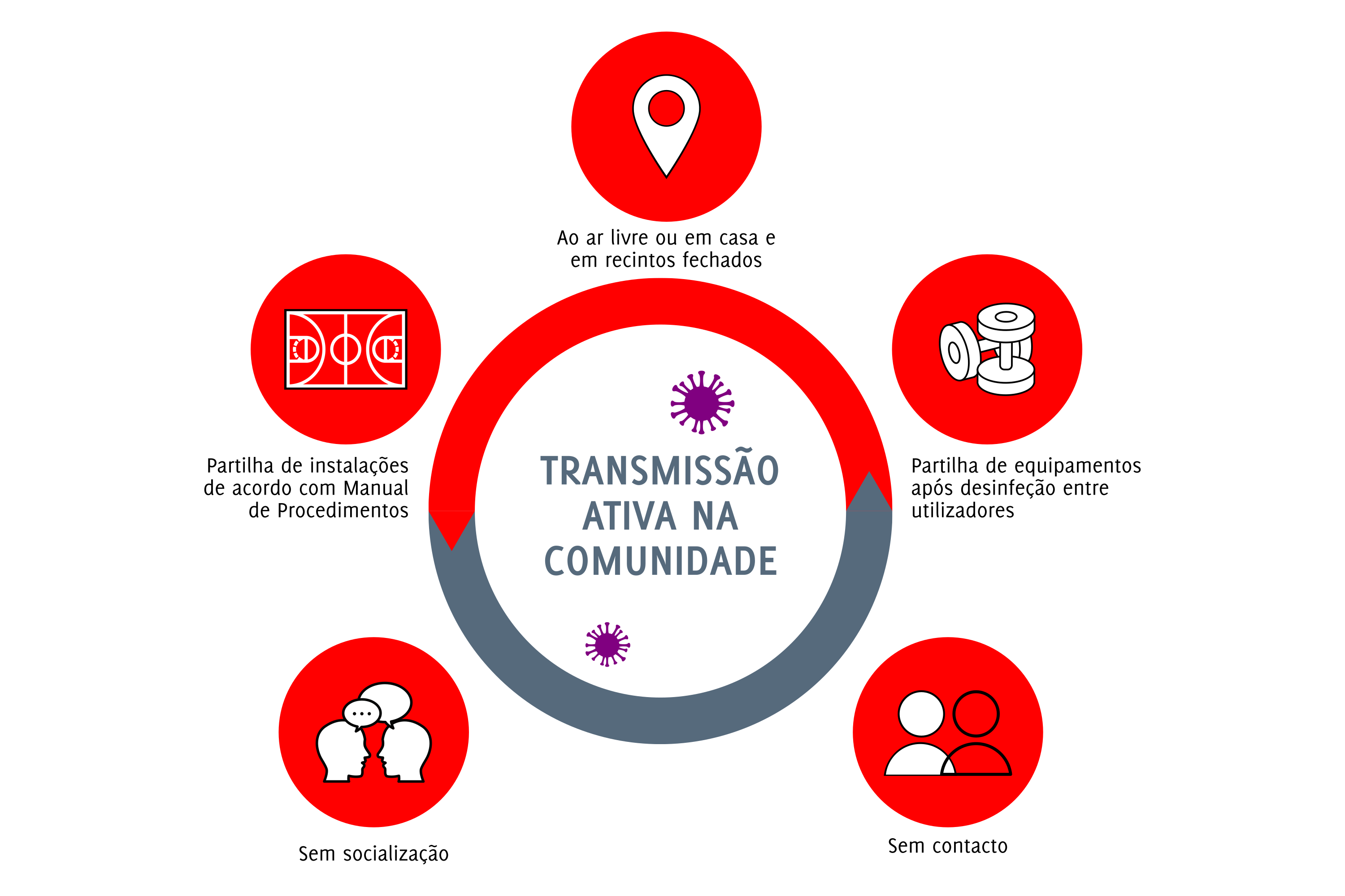 As medidas a implementar, embora devam atender às especificidades de cada atividade, terão sempre como base comum as medidas gerais de proteção (distanciamento social, higiene das mãos, etiqueta respiratória e higiene de superfícies), bem como as orientações mais recentes das Autoridades de Saúde Pública e as normas excecionais decretadas pelo Governo. Como exemplo de medidas específicas para as instalações, podemos referir a interdição do uso de balneários ou a interdição da partilha de equipamentos desportivos.