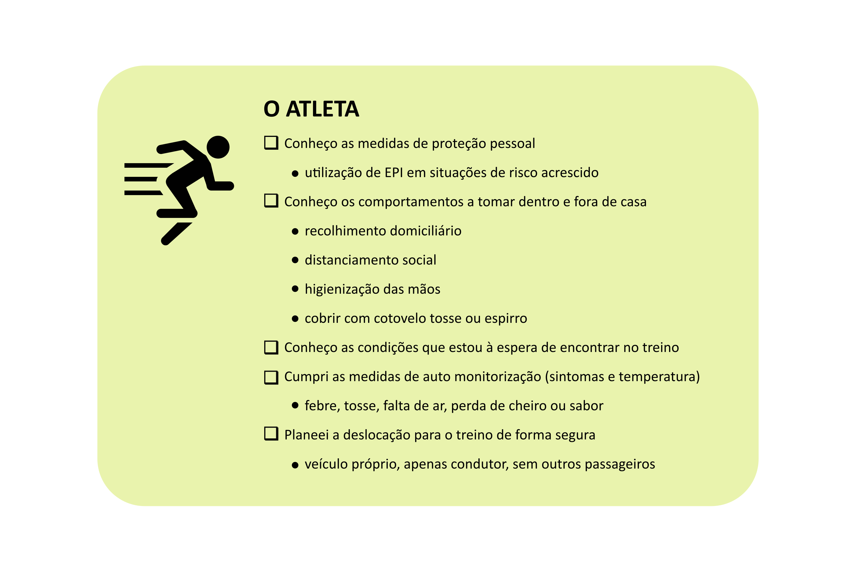 Lista de verificação para identificar se estão atendidos os requisitos da Orientação 036/2020, na sua versão de 31 de março de 2021. É um documento de apoio para federações, clubes, entidades gestoras de equipamentos desportivos, promotores de competições desportivas e restantes agentes desportivos, incluindo atletas.